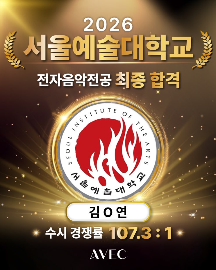 2026학년도 입시에서 아베크 뮤직 아카데미가 다시 한 번 의미 있는 결과를 만들어냈습니다. 올해 아베크는 서울예술대학교 전자음악 전공 최종 2명 합격, 1차 5명 합격(총원 중 33%) 동아방송예술대학교 전자음악 전공 최종 2명, 1차 3명 합격, (총원 중 29%) 음향제작 전공 최종 1명 합격 호원대학교 뮤직프로덕션 전공 최종 8명 합격, (총원 중 27%) 백석예술대학교 뮤직테크놀로지 전공 최종 35명 합격(총원 중 50%) (실제로 훨씬 더 많은데, 조금만 올렸어요...) 숫자는 결과이지만, 그 안에는 수많은 시간과 고민, 포기하지 않았던 학생들의 노력이 담겨 있습니다. 그리고 그 곁에는 언제나 1:1 맞춤 입시 관리 시스템으로 함께한 아베크가....... <img src="https://blogthumb.pstatic.net/MjAyNjAyMTlfNzEg/MDAxNzcxNTAxODEwNjYw.N0mnQPrsdkI5di_OvOPBu9ItYJvQDBcmbEUz-kOO1OYg.Kzty0T1crmr1fdpu7hhb10gTOygKlKskwXSi2SFHSeYg.JPEG/26%C7%D0%B3%E2%B5%B5_%BC%AD%BF%EF%BF%B9%B4%EB_%C3%D6%C1%BE_01.jpg?type=s3" />