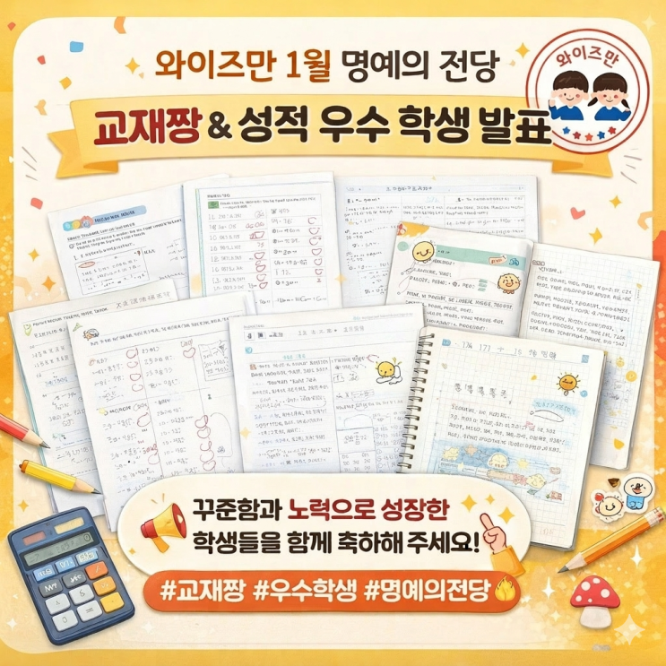 안녕하세요, 와이즈만 송파센터입니다 1월 한 달 동안 성실하게 노력한 학생들의 빛나는 결과를 소개합니다! 이번 달에도 열심히 학습에 참여하며 꾸준함과 노력으로 성장한 우리 학생들을 함께 축하해주세요 1월 교재짱 (우수교재 & 우수일기) 교재를 꼼꼼하게 풀고, 자신의 생각을 잘 정리한 학생들에게 수여되는 교재짱! 특히 우수한 학생에게는 칭찬도장 10개가 지급됩니다. 아래는 실제 우수 교재입니다. 1월 형성평가 우수 학생 꾸준한 학습과 실력 향상을 보여준 형성평가 우수 학생들입니다 각 프로그램별, 학년별로 많은 학생들이 좋은 성과를 보여주었습니다 와이즈만이 전하고 싶은....... <img src="https://blogthumb.pstatic.net/MjAyNjAzMTlfNyAg/MDAxNzczOTAyNTU3NDk0.ogRSpBA-hBwNjdFKysOLODWvX1XR63aBki-yu84Y8Bgg.ljRqC96ox4UJ6dyiPYjIDYDj4xziAaZrG8LF3ksfZNog.PNG/%B1%B3%C0%E7%C2%AF_%C3%D6%C1%BE1.png?type=s3" />