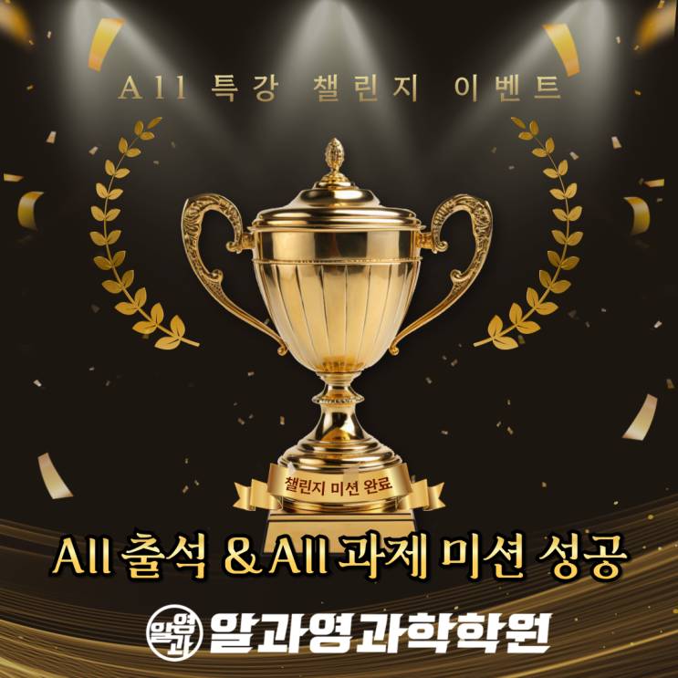 [♥축하합니다! 챌린지 미션 완료♥] 안녕하세요. 알과영과학학원 위례관입니다. 이번 겨울방학 동안 진행된 ‘알과영 챌린지 미션’을 성실히 완수한 학생들을 대상으로 작은 성취를 기념하고, 앞으로의 학습 동기 부여를 위해 소정의 상품(라미샤프) 증정 및 상장 수여식을 진행할 예정입니다. 노력의 결과를 눈에 보이는 성과로 경험하는 것은 학생들에게 큰 자신감과 학습 동기를 만들어주는 소중한 기회가 됩니다. 수여식 당일에는 기념 촬영도 함께 진행하며 학생의 성장을 오래도록 기억할 수 있도록 준비하겠습니다. 앞으로도 학생들이 스스로 목표를 세우고 끝까지 완주하는 힘을 기를 수 있도록 알과영이 함께 하겠습니다. 감사합니다....... <img src="https://blogthumb.pstatic.net/MjAyNjAzMjBfMjUw/MDAxNzczOTkwNzA4MDQy.ZoxQJZ5c32UELQgkZSlaIl3XD3-xpYNYuEyF_rLpovkg.KAlCp5_dFHJB7bj1zktqHhTh_PEqJcQJrZTCkY3-FQMg.PNG/%C3%A7%B8%B0%C1%F6_%B9%CC%BC%C7_%BC%BA%B0%F8%C0%CC%BA%A5%C6%AE_%BB%F3%C0%E5_%BC%F6%BF%A9%BD%C4.png?type=s3" />