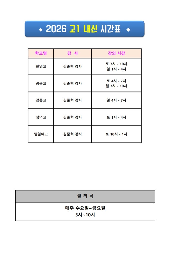 2026 고1 내신시간표