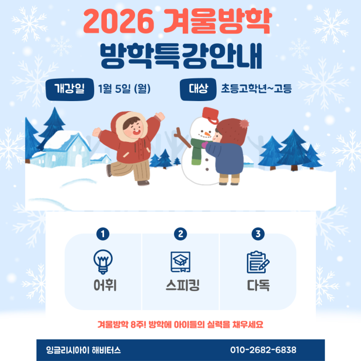 2026 겨울방학 특강 모집합니다. 1. 영어도서관 겨울방학은 다양한 책을 많이 읽으며 즐겁고 의미 있는 시간을 보낼 수 있는 중요한 시간입니다. 영어도서관에서 독서를 통해 아이들의 영어 실력과 사고력이 함께 성장하는 소중한 방학이 되기를 바랍니다! 2. 중등 문법 특강 예비 중등을 위한 쉽고 체계적인 영어 문법 특강으로 중 1 영어를 미리 준비하고 자신감을 키우세요. 문제 풀이와 반복 연습을 통해 확실히 이해하는 수업입니다. 정규반 전레벨 신입생 추가 모집 영어가 언어로 자리 잡는 수업, 지금 경험해 보세요! 소수 정예 수업의 혜택을 누려보세요! 매주 목요일 오전 11시에 학원 설명회가 있습니다. 설명회에 참여하시어 우리 아....... <img src="https://blogthumb.pstatic.net/MjAyNjAxMDRfMjc0/MDAxNzY3NDU1OTM1NDMy.-miEdL63Iy-nsCnQIAmT30zI_5nfol9IxI7hieRB7oog.mUl9Zu4BOZQpwIX5AvMvE8dRdQFOQnkEdVr94Uepxkcg.PNG/%B0%DC%BF%EF%B9%E6%C7%D0%C6%AF%B0%AD_%281%29.png?type=s3" />