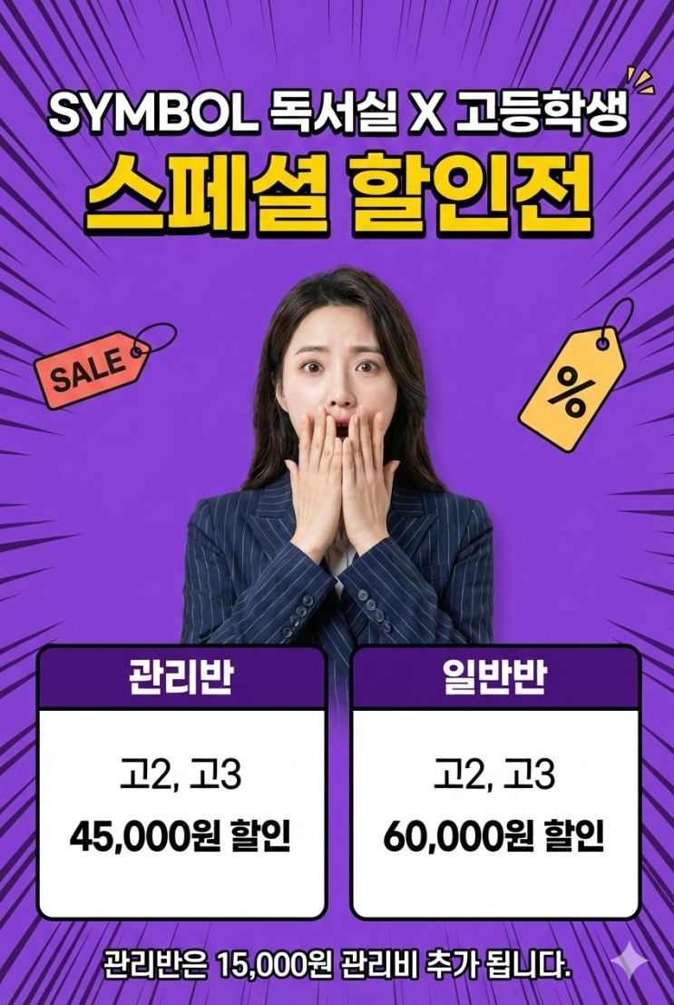 안녕하세요. 부산 서면에 위치한 프리미엄 관리형 독서실, 심블독서실입니다. 겨울방학이 엊그제 같은데, 벌써 3월 개학이 코앞으로 다가왔습니다. 방학 동안 치열하게 만들었던 공부 습관, 개학 후에도 잘 유지할 수 있을지 걱정되시나요? 2026년 대입과 내신을 위해 가장 중요한 것은 '어디서, 어떻게 흐름을 이어가느냐'입니다. 그래서 심블독서실이 고등학생 여러분의 성공적인 새 학기를 위해 특별한 학기 중 할인 혜택을 준비했습니다! 심블독서실 '학기 중 할인' 완벽 안내 (학기 중 O) 가끔 학부모님과 학생분들께서 심블의 할인 제도에 대해 오해하시는 부분이 있어 정확하게 안내해 드립니다. 심블독서실의 고....... <img src="https://blogthumb.pstatic.net/MjAyNjAyMjZfMjIy/MDAxNzcyMDg3NTI5MTgx.LGGco2RazybOhd3Adth1_GeRxt6SVJ_Zkoa40QKczrwg.qaHLwg1a7KeL1aIpuVFmhkAPJKdbGFW5GRyECpNIxD0g.PNG/%C7%D0%B1%E2_%C7%D2%C0%CE.png?type=s3" />