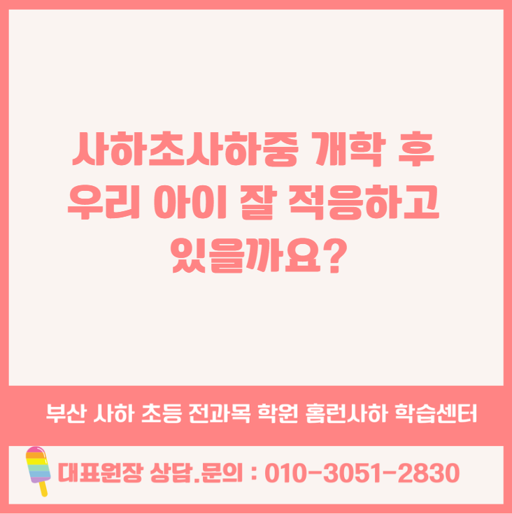 안녕하세요, 사하구 초등중등 수학영어 전문 홈런사하학습센터학원 김은선 원장입니다. 개학이 시작되고 나면 사하초·사하중 학부모님들께서 가장 많이 하시는 말씀이 있습니다. "우리 아이 학교는 잘 적응하고 있을까요?" "공부는 제대로 따라가고 있을까요?" 이번 한 주 아이들의 모습을 지켜보며, 그 질문에 조금이나마 답을 드릴 수 있을 것 같았습니다. 조용하지만 분명하게, 아이들의 공부 습관이 자라고 있습니다. 눈에 보이는 변화, '앉아서 집중하는 힘' 이번 주 가장 크게 느껴진 변화는 앉아서 집중하는 시간이 늘었다는 점입니다. 처음에는 자세가 금방 흐트러지고, 문제를 풀다 집중이 끊기던 아이들....... <img src="https://blogthumb.pstatic.net/MjAyNjAzMjFfMzMg/MDAxNzc0MDk5ODk0NjQx.2FKiyHUNl3H7MZsm_egxuAitGRJgNKua-yKt1Apw1qMg.GWCYe795HRkxNvuolNETVwJm1shEemyEBB75Yv2PRKEg.PNG/%C4%B8%C3%B3.PNG?type=s3" />