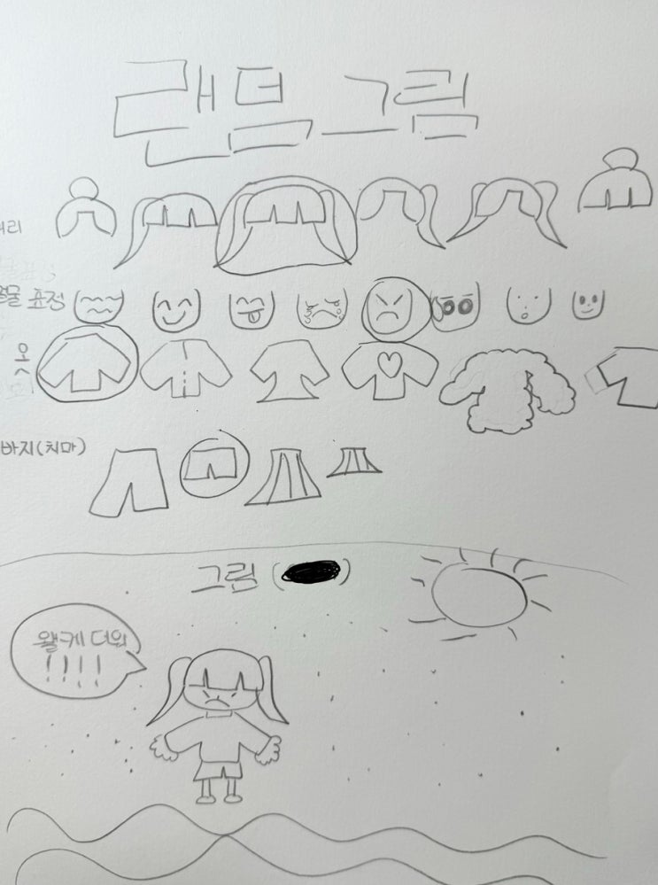 위 그림은 아이가 단순히 그림을 그리는 행위에 머물지 않고… 주변 사람들을 주인공으로 설정하여 그들의 상황과 감정을 대변하는 모습을 보여주는 좋은 예시의 그림입니다. 아이는 저런 그림을 여러장 그렸는데, 각 카테고리에 하나씩 친구들에게 마음에 드는걸 고르라고 한뒤에 친구들이 그걸 고르면 그 선택한 요소를 합쳐서 캐릭터를 만드는 방식이였습니다. 아이가 스스로 고안한 랜덤 그림 시트는 혼자 보는 그림이 아니라 타인이 요소를 고르며 소통할 수 있도록 설계되어 있는데, 이는 사람을 좋아하고 타인과 깊이 연결되고 싶어 하는 아이의 다정한 본성을 잘 보여주는 대목입니다. 또한 미세한 표정들을 나열하고 정보를 범주화하여....... <img src="https://blogthumb.pstatic.net/MjAyNjAyMTZfMjg2/MDAxNzcxMjAxMzgwOTQ1.xKprTLGZmKcb4auwx4XReEoHupA_QS2fvHGFB0OgTUIg.4ASO5j0iZpz53_37KRiEQcwd0mCpgMlXK1E6CTm3byMg.JPEG/IMG%A3%DF0655.jpg?type=s3" />