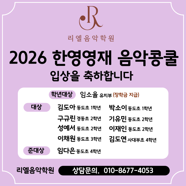 리엘 음악학원 2026 한영영재 음악콩쿠르 입상