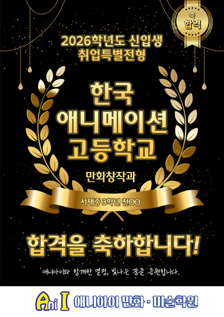 대구 성서 죽전 캐릭터 웹툰 전문 아카데미 : Ani I 애니아이만화미술학원 안녕하세요~ 애니아이 만화 미술학원 반가운 합격 소식 들고 왔습니다~!! 2026년 올해 따끈따끈한 신입생이 된 한국 애니메이션 고등학교 만화창작과 합격생! 무려 취업특별전형으로 합격했다는 멋진 뉴스 전해드립니다~~ (박수 짝짝짝짝) 이번에 우리 애니아이 학생이 합격한 전형은 [취업특별전형] 취업특별전형은 일반전형과 달리 취창업 계획서와 면접도 진행하느라, 준비할 것이 산더미인데요ㅠㅠ 밤새워 답변을 준비한 면접 예상 질문지, 취창업 계획서의 자료조사 등등 현업 실무경력자의 피드백과 함께 꼼꼼히, 열심히 준비했답니다~ 그 힘든 여정에 애니아이와....... <img src="https://blogthumb.pstatic.net/MjAyNjAzMTVfMTgg/MDAxNzczNTYxMDkzMTA0.ABg5cOSrqVMc6KYRgyc_F6VKWTnRjILH06imCiBmBQYg.rAQvz0EiwBWpXyECB_bSoDrdI8rvI8PRklqkItCK1pcg.PNG/2025%C7%D1%BE%D6%B0%ED_%C3%B5%C8%F1%BC%F6_%C7%D5%B0%DD_%C3%E0%C7%CF%C0%CC%B9%CC%C1%F6.png?type=s3" />