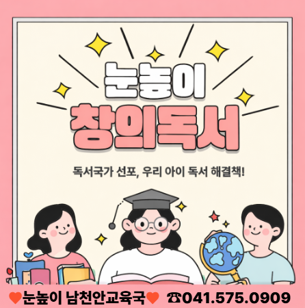 독서국가 선포, 들어보셨나요? 요즘 교육 정책과 학교 현장에서는 ‘독서력’과 ‘문해력’을 미래 핵심 역량으로 강조하고 있습니다. 그만큼 이제 독서는 단순히 책 많이 읽는 것이 아니라 생각하고 이해하고 표현하는 힘을 기르는 필수 교육 요소가 되었습니다. 그렇다면, 우리 아이 독서 교육은 어떻게 준비해야 할까요? “우리 아이, 책은 제대로 읽고 있을까?” “독서 습관은 어떻게 만들어줘야 할까?” 이 모든 고민, 눈높이 창의독서 하나면 해결됩니다. 눈높이 창의독서란? 눈높이 창의독서는 아이의 연령 · 발달 단계 · 학습 수준에 맞춰 전문가가 선정한 도서 + 체계적인 독서 커리큘럼 으로 독서 습관과 사고력을 동시에 키....... <img src="https://blogthumb.pstatic.net/MjAyNjAyMjRfODQg/MDAxNzcxODk1Mjc5MDM4.W1z8z_ZOB7Boht-qUg89dnutrF_pt-xrmVeTV90fQ1gg.qhKSzUJjiJNPd5TSQIqcW5wMagT1E_MdlLIJPPXaWiIg.PNG/image.png?type=s3" />