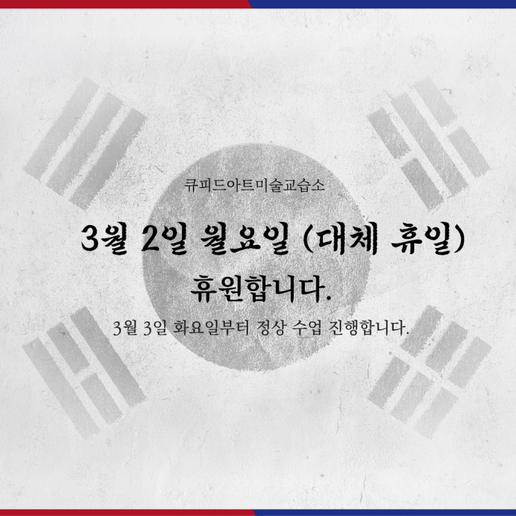 안녕하세요, 큐피드아트미술교습소 입니다! 저희 큐피드아트는 2026년 3월 2일(월)에 휴원합니다. 그날은 수업이 없으니 꼭 참고 바랍니다! 정상 수업은 3월 3일(화)부터 다시 시작하오니, 착오 없으시길 부탁드립니다. 늘 저희 큐피드아트를 믿고 맡겨주시는 학부모님들께 감사드리며, 더욱 즐겁고 알찬 수업으로 찾아뵙겠습니다! 감사합니다~ <img src="https://blogthumb.pstatic.net/MjAyNjAyMjNfODEg/MDAxNzcxODE4MjA2NTcy.1H1ZzJyzRjrfJxs9IanXvvMt7Z51GkrQDbocWyaqo0wg.XlTrCC-NAJ30qDIQIaV-2uNnBx9TZg1yOYL3Zewc5Fwg.PNG/%C1%A6%B8%F1%C0%BB_%C0%D4%B7%C2%C7%D8%C1%D6%BC%BC%BF%E4._%285%29.png?type=s3" />