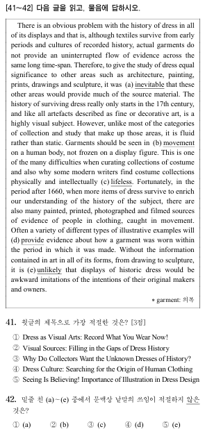 안녕하세요? 입시에 강한 김성준영어입니다. 오늘은 올해 수능 41-42번 지문을 분석하려고 합니다. ✏️ 1. 수능형 독해 구조도 (논리 흐름 시각화 정리) 전체 구조 한눈에 [문제 제기] 의복 전시에는 근본적 문제가 있다 ↓ [이유 1] 연속적인 역사적 증거가 부족하다 (다른 예술 분야와 다름) ↓ [이유 2 - 본질적 차이] 의복은 static(정적)이 아니라 fluid(유동적)이다 → 몸 위에서 움직여야 의미가 완성됨 ↓ [전시의 한계] 마네킹에 고정된 옷은 본질을 왜곡한다 ↓ [보완책] 1660년 이후 그림·사진·영상 자료 활용 ↓ [결론] 맥락 없이 전시하면 어색한 모방(awkward imitation)에 불과하다 출제 포인트 지문 분석: “왜....... <img src="https://blogthumb.pstatic.net/MjAyNjAyMjNfOTUg/MDAxNzcxODExMjI4NjE0.L7cf6xDfzfE2N9qHRcyCCfCEGm8aiGSSHn39oZHdhz4g.yh_H9QzOItHigL1nHi2B6ZZHztfwfc_iv5lp1wXhpwYg.PNG/%BC%F6%B4%C9_41-42.png?type=s3" />