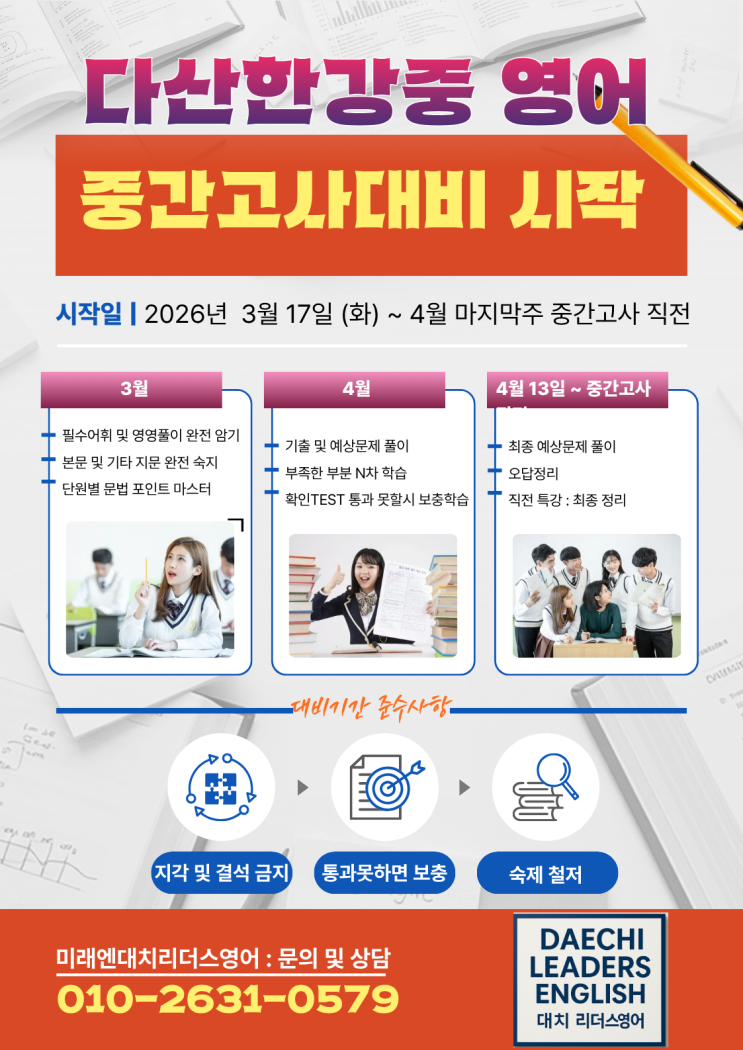 두~둥 안녕하세요. 다산한강중영어 미래엔대치리더스영어입니다. 4월 마지막주에 예정되어 있는 다산한강중 중간지필고사를 대비하여 오늘도 친구들은 열심히 학습중입니다. 지난학기 대비, 내신대비중인 친구들의 성취도가 조금 좋아져서 다행입니다만, 아직 방심할 수 없습니다. 마지막 순간까지 최선을 다해야 하니까요~ 아래는 1과에 나오는 기본단어 및 영영 단어 리스트입니다. 영영은 중간지필에 반드시 나오는 항목인데, 아이들이 많이 실수하는 항목이기도 합니다. 그럼 학원에서 암기후 테스트중인 우리 친구들의 성적표를 좀 볼까요? 짜~쟌!!!! 물론, 실전에 강해야 하고,문법, 본문, 대화문 등에서 약한 모습을 보이는 친구들도 있어....... <img src="https://blogthumb.pstatic.net/MjAyNjAzMjNfMTI1/MDAxNzc0Mjc0MTgyMzI3.4JPcxnfuhYSQVm6fXhdfdbLeG2XFCyc_gdv4RMboreIg.oFzyevBWJyNO2qrIjpiaTGtn3HP3MFV_2QgLAkCGHK4g.PNG/%C1%A6%B8%F1%C0%BB_%C0%D4%B7%C2%C7%D8%C1%D6%BC%BC%BF%E4._%289%29.png?type=s3" />