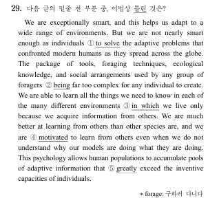 안녕하세요? 김성준원장입니다. 오늘은 올해 수능 29번 문항을 분석하고자 합니다. 오늘도 즐겁고 행복한 날되시길 기원합니다. 자 이제 분석시작해보겠습니다. 문제 핵심 어법상 틀린 부분 찾기 지문 흐름은: 인간이 다른 종보다 지식을 공유하고 학습하는 능력이 뛰어나다는 내용 ✏️ 보기별 분석 ① enough to solve ✔️ 정상 "enough to + 동사원형" 구조 맞음 문제 없음 ② being far too complex ✔️ 정상 (핵심 포인트!) "despite + 명사/동명사" 구조 being 들어간 거 맞음 ③ in which ✔️ 정상 "the many different environments in which we live" 전치사 + 관계대명사 구조 O....... <img src="https://blogthumb.pstatic.net/MjAyNjAzMjNfMzUg/MDAxNzc0Mjc0MzI1Njg2.KvhyraZgbqvuzs79iIJzCkibTTotu5WMyvxzysfA5A8g.-n0OCUIyrMqaZOFFMZe2-ppkWqv4CtJv4dFJhYTm4MQg.PNG/%BC%F6%B4%C929%B9%F8.png?type=s3" />