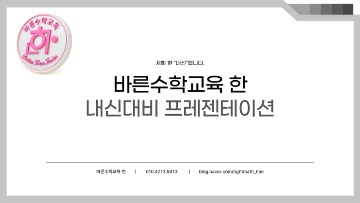 바른수학교육 한에서 오랜만에 인사를 드립니다. 다들 비슷한 하루하루를 보내실거라 생각되네요. 자야지~가 아니라 '어. 잠들었었네?' 라는 멘트와 함께 아침에 일어나 준비하고 하루를 보내고 정신차려보니 다시 아침이 되어있는 마법같은 일상. 그 일상에 잔잔한 물결을 만드는 것이 학생들의 내신 시험이 아닐까 생각됩니다. 학원에게도, 학생에게도, 그리고 가정에 계신 학부모님께도 잔잔하지만 큰 파동이 될 수 있는 내신. 그 내신을 위해 수많은 일들을 보고 견뎌오면서 점수를 잘 만들어주고 싶다는 생각이 많았습니다. 여러 방법을 써보면서 가르치는 일을 한지 20년이 넘은 지금. 여러 개가 남았지만 그 중에서도 하나! 강....... <img src="https://blogthumb.pstatic.net/MjAyNjAzMjRfMTI1/MDAxNzc0MzQ0Njg2NDAw.d6JGSxQ74Fz4LGtalPm4XgIEI8uhIAq7by0uh8Ly8HMg.weKqN2CbKszd6oK1ixRkdmVaa_iRuvDNVdBQdY375mAg.PNG/001.png?type=s3" />