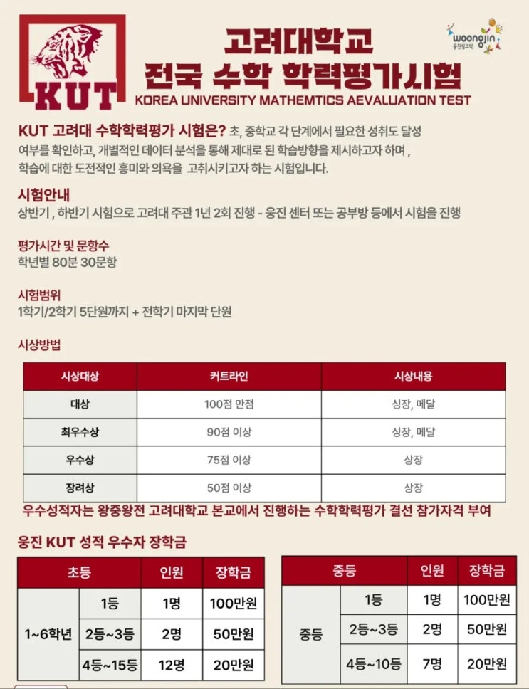 예비초·예비중 필수 도전! 고려대학교 전국 수학 학력평가(KUT) ✔ 우리 아이 수학 실력, 정확히 알고 계신가요? ✔ 중등 대비, 지금부터 객관적인 진단이 필요합니다. KUT 고려대 수학학력평가는 초·중 각 단계에서 필요한 성취도를 확인하고 개별 데이터 분석으로 맞춤 학습 방향을 제시하는 시험입니다. 시험 안내 연 2회 실시 (상반기 / 하반기) 학년별 80분, 30문항 시험범위: → 1학기/2학기 5단원까지 → 전학기 마지막 단원 포함 시상 혜택 대상: 100점 만점 (상장·메달) 최우수상: 90점 이상 (상장·메달) 우수상: 75점 이상 (상장) 장려상: 50점 이상 (상장) ✨ 우수 성적자는 고려대학교 본교 결선 참가 자격 부여! ?....... <img src="https://blogthumb.pstatic.net/MjAyNjAyMjRfMjk3/MDAxNzcxODU5NzYwNjk1.cd05tcooz9DYrRlzv0nPPh_zh1QLk8gryhyeMuiMomkg.ahfG1eV5wGOjpn_nAlh2jqRYH7RpbWrkG6xw5yMZbU4g.JPEG/900%A3%DF1771834158741.jpg?type=s3" />