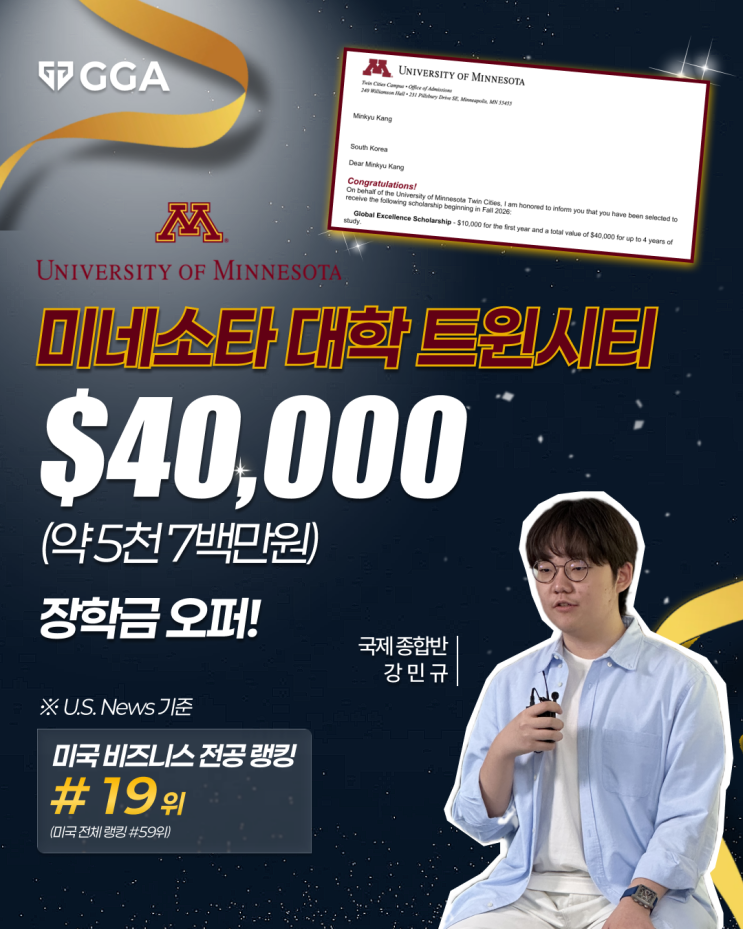 안녕하세요! 젠지글로벌아카데미입니다. 늘 학부모님들께 받는 질문이 있습니다! e스포츠로 진짜 미국 명문대 합격 가능한 이야기인가요? 저희 GGA의 대답은 Yes! 그리고 매번 결과로 증명해내죠! 국제 종합반 장학금 오퍼 소식 University of Minnesota Twin Cities 미네소타대학 트윈시티는 U.S News 기준 미국 비즈니스 전공(경영학부) 랭킹 기준 무려 19위를 차지할 정도로 명성이 자자한 학교라, 매년 지원자들이 모이고 있는 학교입니다. 저희 국제 종합반 수강생이 $40,000 (한화 5천 7백만원) 상당의 장학금 오퍼를 받았습니다. 시대가 바꼈습니다. 아는 학부모님들만 e스포츠를 활용해 미국 대학 합격 + 장학금 오퍼 받습니다! 좋아하는....... <img src="https://blogthumb.pstatic.net/MjAyNjAyMjVfMTMx/MDAxNzcxOTgxMTgyMzg5.XqkdqpTJrJi1zTy7TZwBXj3Ijjyd8xFvmBXApdhV-_cg.RtoPQPgFIrOLt-d7NtXF8HCNF77ahPcAgycblIbjynMg.PNG/%B9%CE%B1%D4_%B9%CC%B3%D7%BC%D2%C5%B8_ver2.png?type=s3" />