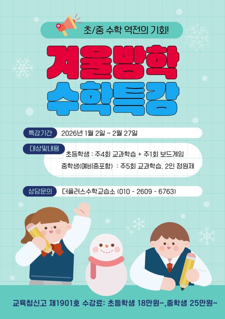 이번 겨울방학도 알차게 보내고자 하는 학생들을 위해 "매일 수학반" 특강을 개설했습니다. 초등학생들은 주4일 교과학습 + 주1일 보드게임으로 구성할 예정입니다. ▶ 교과 학습 시간에는 다음 학기 예습을 진행합니다. ▶ 보드게임 시간에는 수학적 논리력, 공간지각력을 주제로 한 보드게임을 진행할 계획입니다. 초등학생들과 수학 공부를 해보면 개인적인 경험치의 차이가 커서 공간지각력, 문제이해력의 격차가 학년이 올라 갈수록 많이 나게 되는 것을 느낍니다. 그런 부분을 학기 중에 시간적인 한계로 채워주지 못해서 아쉬운 부분이 있습니다. 그래서 겨울방학 동안 수학 학습에 도움이 되는 보드게임을 선정해 특강으로 진....... <img src="https://blogthumb.pstatic.net/MjAyNTEyMTNfNDIg/MDAxNzY1NTUyOTkwNDgz.brmX9V9Gc-QR6h5xlwt_CvOK4alz97IbRmfid7GFkvwg.I9S5GKB_bwF5XSVFuMRBo4pzLla5nVPbluh9brlVaTYg.JPEG/26%B0%DC%BF%EF%C6%AF%B0%AD2.jpg?type=s3" />