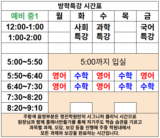 명진영수학원 중등부 겨울방학 특강 교재 안내 및 시간표