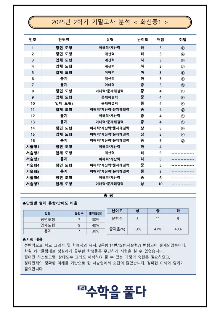 2025년 2학기 기말고사 분석 < 화신중1 >