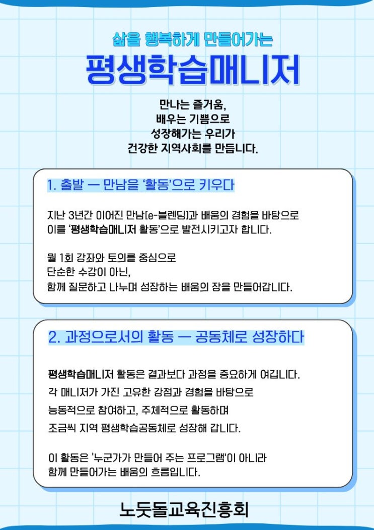 평생학습매니저란 지역 평생학습의 파트너로 자신의 성장은 물론 학습을 설계 , 독려하고 지역 공동체 실현에 기여하는 활동가입니다. 평생교육사 2급 소지자 평생교육을 실천하고 있는 실천 가 평생교육에 관심있는 분 등 지역의 평생교육 실천가를 모십니다. 평생교육사 같이의 가치 - 함께 배우고 질문하며 실천하는 과정을 통해 삶속에서 이어지는 배움의 힘을 만들어갑니다. - 사람과 사람을 잇는 지속적인 배움의 여정입니다. 평생학습매니저 <img src="https://blogthumb.pstatic.net/MjAyNjAxMTZfMjQw/MDAxNzY4NTExMjMyNjY0.pcCMA_Vubq7hQDhcD8XtYG0rDXYVx-SLc1-pvn0s7m0g.jID40MoBjKe1FHVV7JileE-vEV-pzZzjZ43Uoote9KMg.JPEG/%C6%F2%BB%FD%C7%D0%BD%C0%B8%C5%B4%CF%C0%FA_%282%29.jpg?type=s3" />