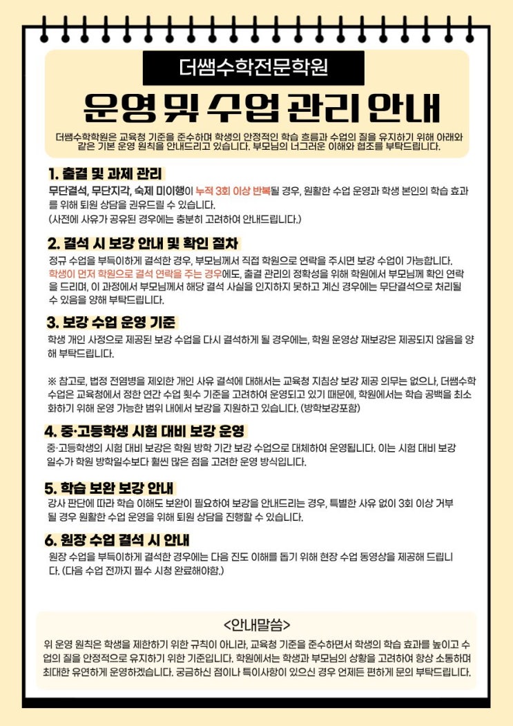 더쌤수학학원 운영 및 수업 관리 안내 더쌤수학학원은 교육청 기준을 준수하며 학생의 안정적인 학습 흐름과 수업의 질을 유지하기 위해 아래와 같은 기본 운영 원칙을 안내드리고 있습니다. 부모님의 너그러운 이해와 협조를 부탁드립니다. 1. 출결 및 과제 관리 무단결석, 무단지각, 숙제 미이행이 누적 3회 이상 반복될 경우, 원활한 수업 운영과 학생 본인의 학습 효과를 위해 퇴원 상담을 권유드릴 수 있습니다. (사전에 사유가 공유된 경우에는 충분히 고려하여 안내드립니다.) 2. 결석 시 보강 안내 및 확인 절차 정규 수업을 부득이하게 결석한 경우, 부모님께서 직접 학원으로 연락을 주시면 보강 수업이 가능합니다. 학생이 먼저 학원....... <img src="https://blogthumb.pstatic.net/MjAyNjAxMjZfMjcy/MDAxNzY5NDI4MTYxMDM2.TpnlEz3PSSr_vofEux7BZ5wCd6tzQr9CUfXDm91DLV0g.-gWE85y8FzQiYjL7_0hFKCehcheZgxO8plg4oK6Yf0wg.JPEG/%C1%A6%B8%F1%C0%BB_%C0%D4%B7%C2%C7%D8%C1%D6%BC%BC%BF%E4._%281%29.jpg?type=s3" />