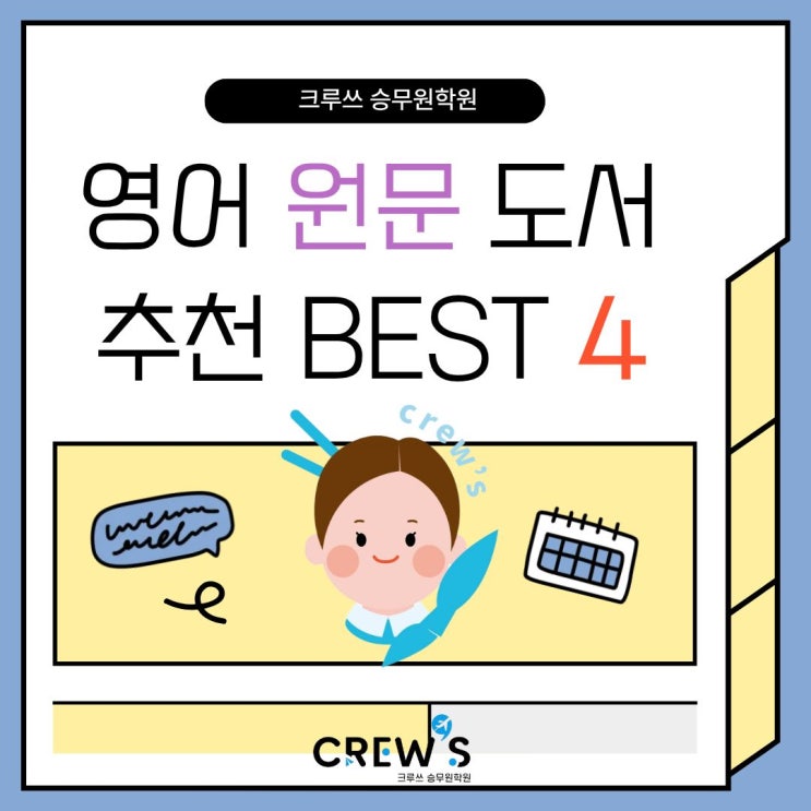 안녕하세요:) 크루쓰 승무원학원입니다 오늘은!! 영어 공부를 해야 한다는 건 알지만 문법책·단어장만으로는 쉽게 지치게 됩니다. 그래서 크루쓰에서 ‘읽으면서 태도·서비스 마인드·면접 소재까지 함께 쌓을 수 있는 영어 원서’를 추천해드릴려고 합니다~ 오늘은 예비 승무원이라면 꼭 한 번쯤 읽어보면 좋은 영어 원문 도서 4가지를 소개합니다 1️⃣ The Alchemist Paulo Coelho 이 책은 영어 원서 입문용으로 가장 많이 추천되는 작품 중 하나입니다. 문장이 길지 않고 표현이 단순해, 영어에 부담이 적으면서도 메시지는 깊습니다. 주인공이 자신의 꿈을 찾아 여행하는 과정은 승무원을 꿈꾸며 준비해 나가는 예비 승무원의 모습과도....... <img src="https://blogthumb.pstatic.net/MjAyNjAxMjZfMzUg/MDAxNzY5NDExNTIxNTUw.ZdrcVgdfE-10ogh2JO0V005pWvr0i1oXUEEpUPXaexAg.0NUY24HppfdkkePPsQldCkGpyMLBU-PndBMugKUx3KMg.JPEG/1.jpg?type=s3" />