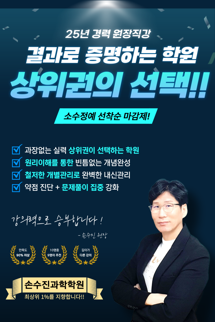 25년의 내공, 과장 없는 실력으로 증명합니다. 안녕하세요, 손수진과학학원 원장 손수진입니다. 학원을 선택하실 때 화려한 광고 문구와 '자기주도학습'이라는 그럴듯한 포장지에 가려 정작 중요한 "수업의 본질"을 놓치고 계시진 않나요? 저는 오늘, 25년 동안 지켜온 고집스러운 교육 원칙을 가감 없이 말씀드리고자 합니다. 1. 허위·과장 광고 대신 '상위권의 결과'로 말합니다. 저희는 없는 실적을 부풀리거나 자극적인 문구로 현혹하지 않습니다. 저희 학원에는 소문을 듣고 찾아온 상위권 학생들이 모여 있고, 그들이 만들어내는 압도적인 성과가 곧 저희의 명함입니다. 공부를 제대로 하고 싶은 학생들이 모....... <img src="https://blogthumb.pstatic.net/MjAyNjAyMjRfODgg/MDAxNzcxOTI1MTY0ODM2.arjKhHIx9w3cqJQ8mrin1YmdaATVGWyBug36ui40h8og.0rVjiYHnmtJ1pbQc8pJ5JO2EHDpcN3uRitxa2AVmEzwg.PNG/%C1%A6%B8%F1%C0%BB-%C0%D4%B7%C2%C7%D8%C1%D6%BC%BC%BF%E4_-001.png?type=s3" />