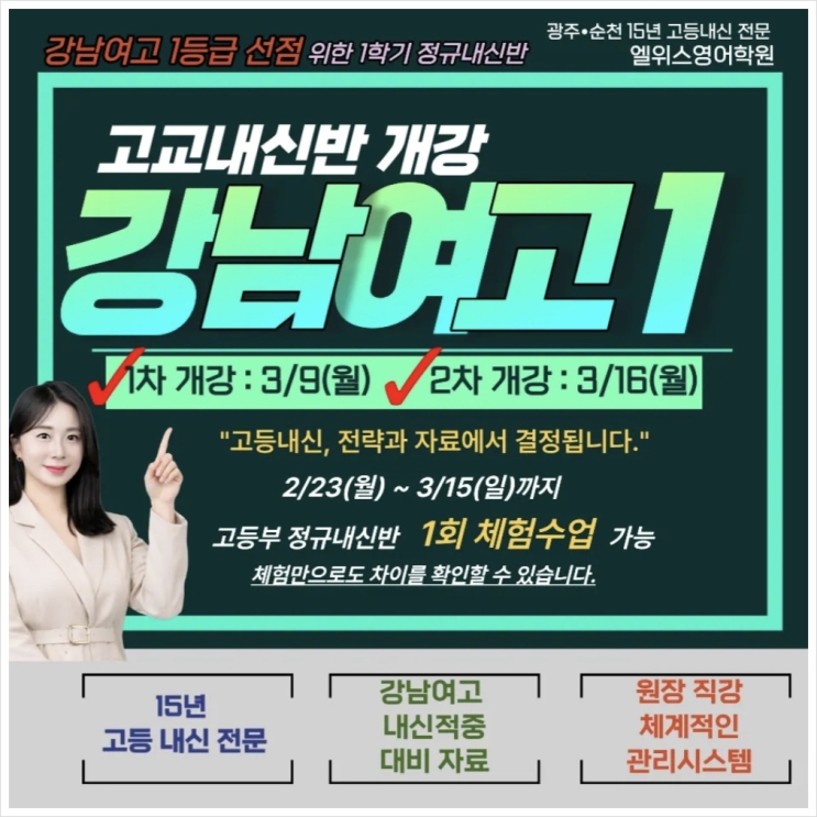 강남여고1 정규 내신반 개강 안내 안녕하세요. 꿈을 빌드업하는 엘위스영어입니다. 엘위스영어에서 강남여고 1학년 정규 내신반을 개강합니다. ■ 15년 고등 내신 전문, 학교별 맞춤 대비 엘위스영어는 광주관·순천관에서 15년 이상 고등 내신을 전문적으로 지도하며, 30여 개 이상 고등학교 내신을 직접 분석·대비해왔습니다. 이 축적된 데이터를 바탕으로 강남여고의 출제 경향에 맞춘 자료와 수업으로 보다 정확하고 체계적인 내신 대비를 진행합니다. ■ 강남여고 내신반 운영 특징 ✔ 강남여고 출제 경향 반영 맞춤 수업 ✔ 원장 직강 중심 서술형·심화 관리 ✔ 학생별 수준에 맞춘 개별 학습 및 성적 관리 ✔ 내신 1등급 대비 구조 분석 중....... <img src="https://blogthumb.pstatic.net/MjAyNjAyMjRfMTc3/MDAxNzcxOTM1NDk3ODgy.Q3DmqFTaBpSbjzJgkftZB3Cc11vCJjqlGwwFnjxlfYYg.MzJ5GU0dXcCsk8HAZu2ZiojBiScIxu6xuoi_O_IT_isg.PNG/image.png?type=s3" />