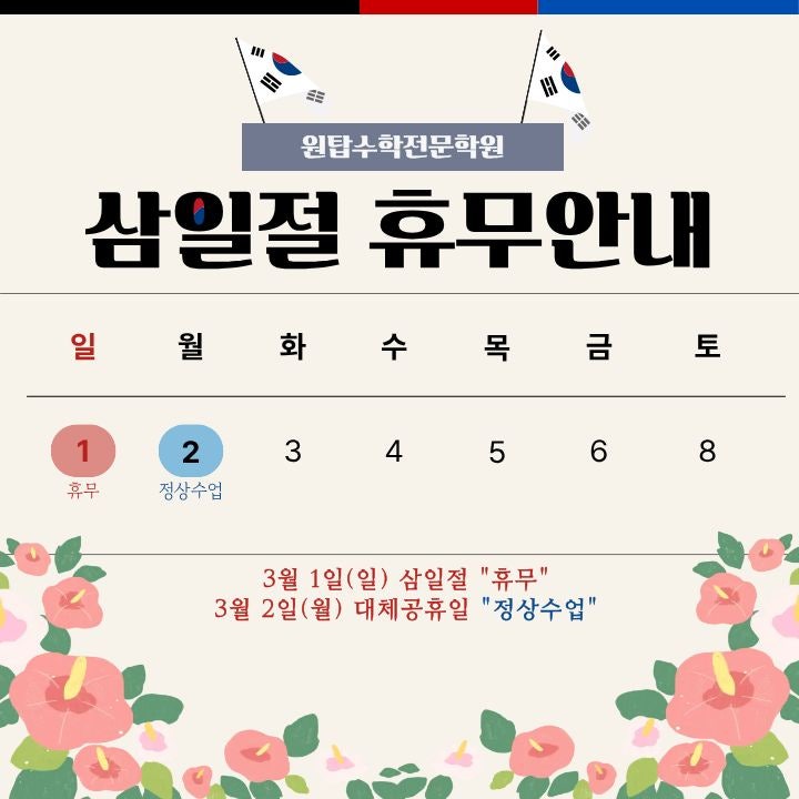 안녕하세요~ 광주 수완지구 수학 전문, 원탑수학학원입니다^^ 3월은 ‘새 학기’가 시작되는 달이죠. 우리 아이가 수학을 **다시 시작할 용기**를 내는 달이기도 합니다. 그래서 더 미리, 더 정확하게 안내드릴게요 :) [2026년 3월 일정 안내] - 3/1(일) : 학원 휴무 - 3/2(월)부터 : 정상 운영 [원장님 한마디] 쉬는 날은 ‘멈춤’이 아니라 ‘정비’입니다. - 새 학기 수학 골든타임은 **바로 지금**이에요. - 3월 초 리듬을 잡아두면, 한 학기 내내 흔들리지 않습니다. [원탑수학학원 수업 포인트] 1:1 과외식 맞춤 수업: 아이가 ‘이해될 때까지’ 설명합니다. - 진도 기반 수업 운영: 성적보다 ‘현재 위치’에 맞춰 가장 빠른 길로 갑니다....... <img src="https://blogthumb.pstatic.net/MjAyNjAyMjRfMTU0/MDAxNzcxOTA3MTE4NjEw.LhhHUvggKPijsXus-jPkCRNb0hWrqBLyYSu370zf1VEg.QbEdJkBAIBluY99wqJCOX7GYMZFksa4pULp4fGqGvtog.JPEG/%C1%A6%B8%F1%C0%BB_%C0%D4%B7%C2%C7%D8%C1%D6%BC%BC%BF%E4..jpg?type=s3" />