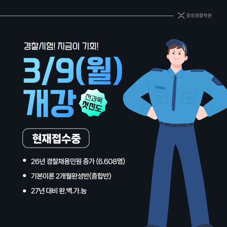 경찰시험! 지금이 기회인거 아시나요? 2026년 경찰채용인원이 증가되었죠? 올해 6.608명 선발! 전년도 보다 약 1,000명이 증원된 인원입니다. 향후 경찰채용인원은 증가 된다고 하니, 경찰공무원 시험도전은 지금이 기회인것 같습니다. 시험관련 주요 변경사항을 간략하게 알아볼까요? 채용절차의 변동과 함께 26년 이후에도 선발인원은 증가 될 전망이기 때문에, 경시생들에게는 지금 가장 좋은 최적의시기 인것 같습니다. 경찰공무원 시험준비 가장 첫번째 단계인 기본이론반 3월 9일 월요일 전과목 첫진도 개강이 진행됩니다. 채용인원이 증가해도 열심히 준비 한 사람만이 기회를 잡을 수 있습니다. 그 기회를 잡기 위한 가장 첫번째, 기초를....... <img src="https://blogthumb.pstatic.net/MjAyNjAyMDlfOTgg/MDAxNzcwNjIxNjExNzIy.QtQCcJOfK9635u_V1qYfXD25D15vECP-U_o9g1AKJi8g.U80qT5OAsX51aLYCb0aVMlkQoZir31m9302SruN3TmYg.PNG/3%BF%F9%B0%B3%B0%AD.png?type=s3" />