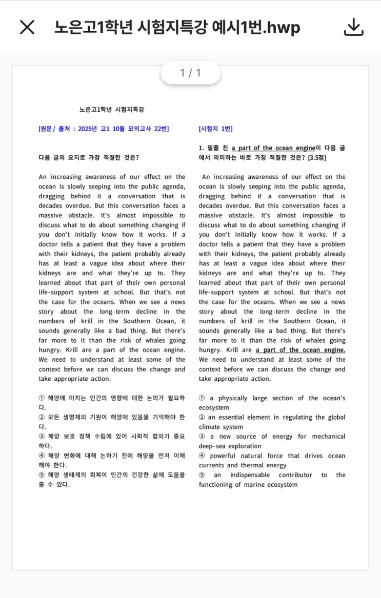노은고예비고1, 지족고예비고1, 2025년 영어시험지특강