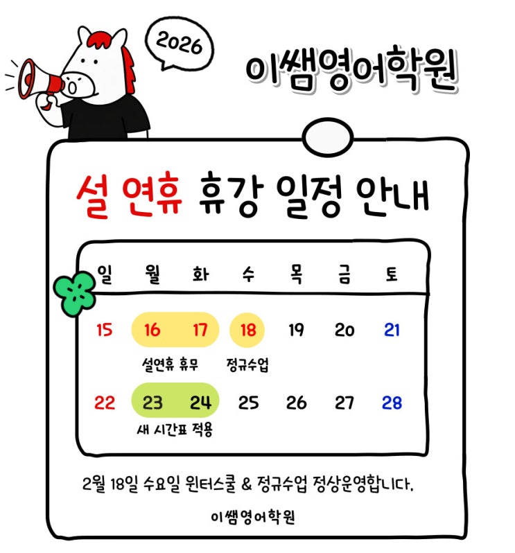[이쌤영어학원] 2026 설연휴 & 새학기 시간변경 안내★