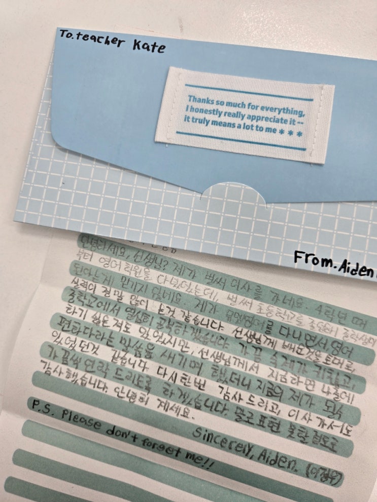 안녕하세요 뮤엠영어 둔곡점 케이트 원장입니다 새해는 변화가 있는 시기인데요 너무 아쉽게도 여러 가지 이유로 저와 작별하게 된 아이들이 있었어요 다른 동네로 이사 가는 친구, 새로운 운동을 하게 되면서 다른 동네 학원으로 가게 된 친구, 아버지 전근으로 타시도로 이사 가는 친구들까지 헤어짐은 너무 아쉽지만 그동안 최선을 다해 지도했기에 다른 곳에 가서도 즐겁게 공부하리라 믿어 의심치 않습니다 어머님과 학생에게 받은 레터 ✉️ 그동안 제가 주었던 열정과 애정의 몇 배를 돌려받은 기분이어서 눈물이 핑 돌아요 어떤 선물보다도 가장 귀한 건 바로 이런 진심이 아닐까 싶어요 수업은 지식을 전달하는 일이기도 하지만....... <img src="https://blogthumb.pstatic.net/MjAyNjAyMTdfMzcg/MDAxNzcxMjkyMzI4MzAy.v9rvnCppmHusojw3mNLUmUy6vYPY8YzHOXS35sK326wg.tiZrwVLB15zznR64gleZzG2X-HHPm2h0BANOfjvoP7Ug.JPEG/900%A3%DF20260212%A3%DF201244.jpg?type=s3" />