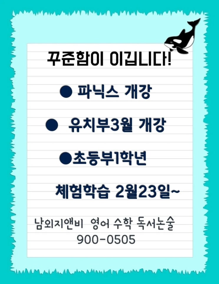 안녕하세요 남외지앤비 영어 수학 독서논술 학원입니다 ^^ 초등 1학년 체험 수업합니다. 유치원에서 영어를 배웠는데 초등학교 들어가면 다른 과목도 배워야 할 것도 많은데 고민하시죠? 영어 말하기 실력은 매일매일 하루하루 연습에 의해서 이뤄진다는 것을 모두 알고 계시죠? 체험 학습에 한번 참여 해 보세요. . 궁금하시면 연락주세요 052-900-0505 <img src="https://blogthumb.pstatic.net/MjAyNjAyMTVfMzAw/MDAxNzcxMTA3MDQ0NDYy.TLaykeyZ72d0nIke0YzZCDYQ6Z8HYVlz9uVNHomCRzog.AMw71IZazE8yel1llAomwuF-IW1iI5W2y5SpeCWqOjMg.JPEG/900%A3%DF1771045878041.jpg?type=s3" />