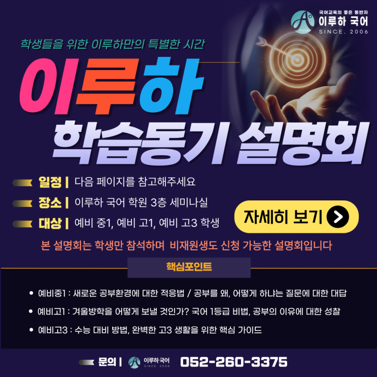 안녕하세요, 국어 교육의 좋은 동반자 이루하 국어 학원입니다. 새로운 학년을 앞두고 우리 아이들이 '왜 공부해야 하는지', '어떻게 시작해야 하는지' 막막해하고 있지는 않나요? 학생들의 변화하는 학습 환경에 완벽히 적응하고, 강력한 학습 동기를 심어주기 위한 **[이루하 학습동기 설명회]**를 준비했습니다. 이번 설명회는 특별히 학생들만 참석하며, 비재원생도 신청 가능하니 소중한 기회를 놓치지 마세요! ️ 일정 및 대상 안내 각 학년별로 맞춤형 강연이 진행되오니 일정을 꼭 확인해 주세요. 예비 고1 (현 중3) 일시: 1월 6일(화) 오후 5시 강사: 이루하 국어 학원 원장님 주제: 겨울방학 활용법 & 국....... <img src="https://blogthumb.pstatic.net/MjAyNTEyMjlfODYg/MDAxNzY3MDAyODQzMTcw.4tsR9ov5gvm7kWEL2ksm_LsFL0bMHi1RN4eGrElkSr4g.ZpLbgMw6ySz8NzLwWIal7-4NJt0d02puI61c-gShjAMg.PNG/001.png?type=s3" />