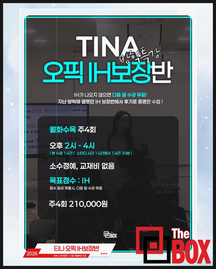 영어회화를 시작하려는 분들이 가장 많이 하는 고민은 "어디서, 어떻게, 얼마나 자주 말할 수 있느냐"예요. 다니간에 끝나는 수업보다 지속적으로 영어를 쓰는 환경이 훨씬 중요하기 때문이에요. 그래서 대구에서 영어회화를 찾는 분들께는 단순 수업이 아니라 실제로 영어를 쓰게 되는 구조를 먼저 안내드리고 있어요. 이 구조는 일반 회화 수업뿐 아니라, 겨울특강으로 진행되는 오픽 대비 수업에도 그대로 적용돼요 영어회화 수업의 핵심은 '말하는 시간'이에요 영어회화 수업은 듣는 시간이 길어질수록 효과가 떨어져요. 더박스에서 운영하는 영어회화 프로그램은 한 명이 말하는 시간이 자연스럽게 확보되도록 구성되어....... <img src="https://blogthumb.pstatic.net/MjAyNTEyMThfMTk4/MDAxNzY2MDYwMzk4MjA3.RE-uEHmYZW78F9jYxWZffqUDoKmss87DmNuOUNfkr4wg.N89FhV5oCvsJC2jPtnaFyjNKmvjH34FtIretYMU7euog.JPEG/KakaoTalk_20251214_121105471_06.jpg?type=s3" />