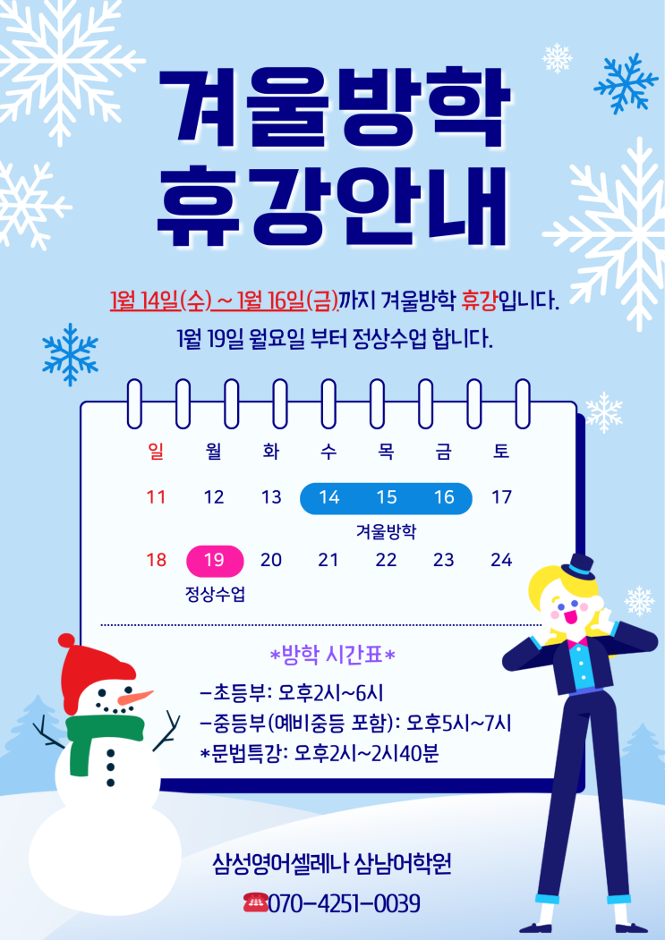 안녕하세요. 삼성영어셀레나 삼남어학원입니다. 학원 겨울방학 휴강 안내드립니다. 1/14(수)~1/16(금)까지 겨울방학 휴강입니다. 1/19 월요일부터 정상수업 합니다 :) <img src="https://blogthumb.pstatic.net/MjAyNTEyMjJfMTQ5/MDAxNzY2MzgwNDc0MTg0.tWc5iIvskMw48V6w5e4yRxr5FdI37sBjLo86aYvWbGsg.8jsPw0sL7J3EZAi8B-H-NsmABHx2jZ9bXVy3OWrS20cg.PNG/2026_%B0%DC%BF%EF%B9%E6%C7%D0_%BE%C8%B3%BB%B9%AE.png?type=s3" />