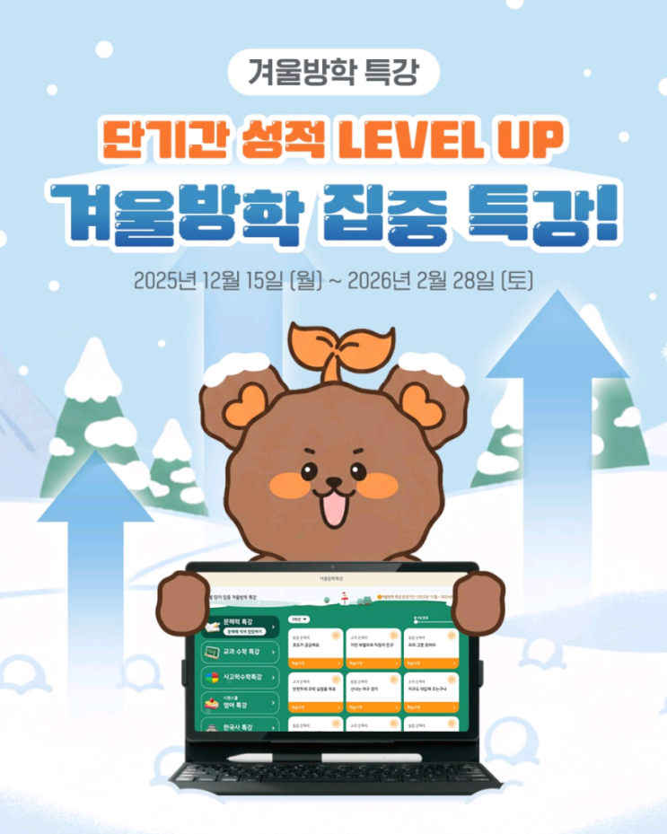 완벽한 새학기를 준비하고 싶다면? 스마트올 겨울방학 특강! ☃️ 1.,문해력특강으로 AI한자어휘.학년별 학습어휘 공부하세요 2.,교과 사고력 수학으로 방학동안 1-6학년 학년별 연산 또는 도형 단원 집중 학습해보세요 3. 영어특강으로 시원스쿨의 기초 영어법과 슈퍼키즈 영단어의 어휘 공부까지 학습해보세요 4. 한국사특강으로 시대별 한국사의 핵심 영상으로 학습하고 한국사능력시험 문제로 개념점검 문제풀이까지 레벨업 해보세요 영역별로 아이에게 필요한 학습을 방학 동안 공부하기 딱! 좋겠죠? 단기간 성적 끌어올려~ 겨울방학 집중 LEVEL UP ↗️ ✅ 기간: 2025. 12. 15 (월) ~ 2026. 2. 28 (토) 스마트올로 이번 겨울방학 알차....... <img src="https://blogthumb.pstatic.net/MjAyNTEyMjNfMTc0/MDAxNzY2NDc2OTIxNTgy.0neg61-Q06G9QMPya3MxfpHOVfiDK4DIacDO5SqX4kIg.ZHYEY96oXRZkK7zgyCwB0g7CZx0O-hZ36_xbXcoCfcEg.PNG/900%A3%DFDSRjjzAjTKq%A3%DF5.png?type=s3" />