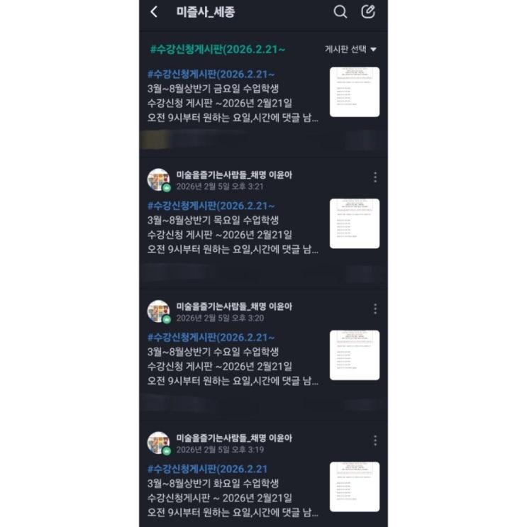 오늘부터 (기존회원 우선)수강신청 게시판 오픈했습니다~ 오늘 등록 하신 수강타임,요일로 3월부터 아이들 볼께요~ 오전 11시 수강신청 현황 ~목요일 제외 전요일 5시타임 마감 ~화요일 4시타임 마감 신규 수강생 문의 받습니다 수강 가능 요일/타임 문의 010 7242 6228 #미술을즐기는사람들학원#미즐사세종#세종미술학원#조치원미술학원 유치부,초등부,중등부~성인클래스 수업 <img src="https://blogthumb.pstatic.net/MjAyNjAyMjFfMTg3/MDAxNzcxNjQwMzY4MDcy.jLPUSwmx3b4shsayPVeBBhZcuHNZrUCEv-kXv1Kz-QQg.nfgu-bRiYh5Dp8wK_KEAdlL606G-A_INwMazwkIG_xUg.JPEG/900%A3%DFinstasize%A3%DF260221105533.jpg?type=s3" />