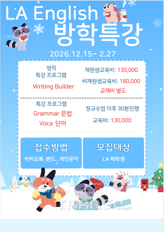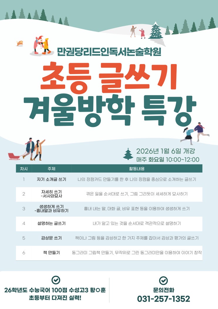 저희 만권당리드인 독서논술학원에서는 방학동안 장르별 글쓰기 특강을 초등반과 중등반으로 운영합니다. 초등반은 자세하고 정확하고 생생하게 표현하기를, 중등반에서는 수행평가 대비 글쓰기에 초점을 맞춥니다. 날마다 책읽기반에서 겨울방학 때 열심히 읽어 읽기 능력이 한 단계 껑충 성장할 수 있기를 바랍니다. 읽기 능력의 향상 없이는 공부 능력의 향상도 한계가 있습니다. 이번 겨울 읽기 능력의 향상을 선물해주세요~~ 역사를 아는 사람과 모르는 사람은 책읽을 때 이해의 폭도 달라집니다. 시대물을 읽을 때도 이해의 폭에 한계가 있습니다. 역사 자체도 중요하지만 폭넓은 이해를 위해 꼭 필요한 역사 공부를 할 수 있도록 해 주세....... <img src="https://blogthumb.pstatic.net/MjAyNTEyMTlfMTAw/MDAxNzY2MTQxMTYxOTUy.zUIIya_uOx7VUujhKRzPC1eIIgKyPJDFVCQimRk5pw8g.0Fp7XEQq2WC9LRiZNNegIYUnYF9BJpnIc3sG9MEObi8g.JPEG/KakaoTalk_20251209_140839773_01.jpg?type=s3" />