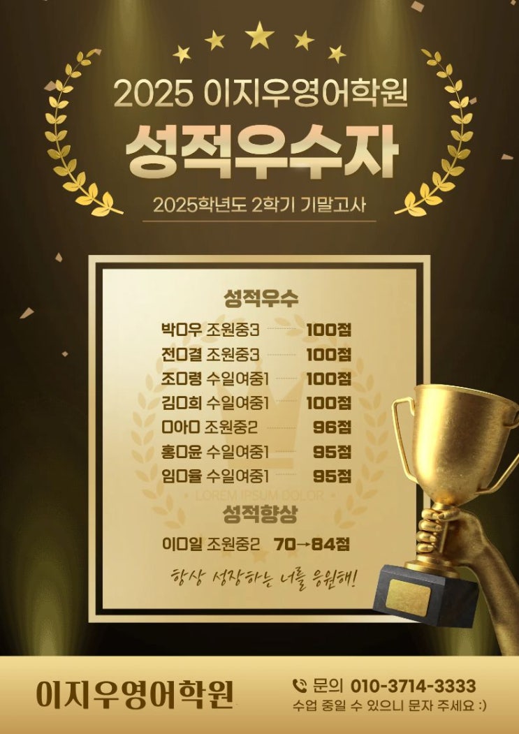 안녕하세요. 이지우영어학원입니다. 2025학년도 2학기 기말고사가 마무리되어, 이번 시험에서 좋은 결과를 낸 학생들을 안내드립니다. 이번 시험에서는 기본기를 꾸준히 다져온 학생들 중심으로 만점자와 안정적인 고득점이 다수 나왔고, 학습 습관을 차근차근 잡아가며 눈에 띄는 성적 향상을 보인 학생도 있었습니다. 성적 우수자 박○○ (조원중3) – 100점 전○○ (조원중3) – 100점 조○○ (수일여중1) – 100점 김○○ (수일여중1) – 100점 조○○ (조원중2) – 96점 홍○○ (수일여중1) – 95점 임○○ (수일여중1) – 95점 시험 직전 벼락치기보다는 평소 수업 참여도와 과제 이행, 오답 관리가 잘 이루어진 학생들입니다. 학년이....... <img src="https://blogthumb.pstatic.net/MjAyNTEyMTdfNjgg/MDAxNzY1OTU5NzExNDMz.ulU9iNplgKzTxnspb2hxWkULtS5iQRVVgB3U6Gb8bXIg.qKGdnnouOjQ8_wTs35ufbNqHDRdvP8exQe40MLcyuVMg.JPEG/%C1%A6%B8%F1%C0%BB_%C0%D4%B7%C2%C7%D8%C1%D6%BC%BC%BF%E4._%2821%29.jpg?type=s3" />