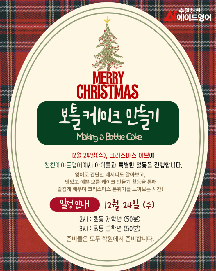 안녕하세요, 천천에이드영어입니다 :) 중학교 내신 기간이 끝나니깐 벌써 크리스마스가 성큼 다가오네요 올해 크리스마스 이브 (12월 24일 수요일) 천천에이드영어 에서 아이들과 함께 보틀 케이크 만들기를 진행합니다. 영어로 간단한 레시피도 함께 알아보고, 맛있고 예쁜 보틀 케이크를 직접 만들어보며 즐겁게 크리스마스 분위기를 느껴보려 합니다 일정 안내 12월 24일(수) · 2시 — 초등 저학년 · 3시 — 초등 고학년 재료 및 준비물은 모두 학원에서 준비합니다. 연말을 맞아 아이들에게 작지만 즐거운 추억이 될 수 있도록 정성껏 준비하겠습니다 [에이드영어 수원천천캠퍼스] 천천에이드영어는 학....... <img src="https://blogthumb.pstatic.net/MjAyNTEyMTlfNzAg/MDAxNzY2MTEzMzI1MDc3.WDPChGWO3m3VQDZP9D95WopHMAVFeHDZq7Ob8kEvWx4g.tIymA-b0FtSOhDObxGlpvMANQ_rBemD6Y7veHCCsySgg.PNG/%BA%B8%C6%B2%C4%C9%C0%CC%C5%A9_%B8%B8%B5%E9%B1%E2.png?type=s3" />
