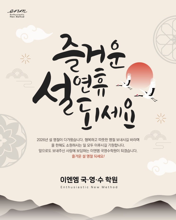 안녕하세요. 이엔엠 국영수 학원입니다. 2026년 병오년 새해가 밝고 어느덧 민족 대명절 설날이 다가왔습니다. 항상 저희 학원을 믿고 소중한 아이들을 맡겨주시는 학부모님들께 깊은 감사의 인사를 올립니다. 이번 설 연휴 동안 우리 학생들이 충분한 휴식과 가족과의 소중한 시간을 통해 재충전할 수 있기를 바랍니다. * 휴강 기간 : 2월16일(월) ~ 2월18일(수) * 정상 수업 : 2월 19일(목)부터 모든 수업 정상 진행 가족분들과 함께 웃음 가득한 명절 보내시길 바라며, 학원에서도 연후 이후 더 열정적인 강의로 보답하겠습니다. 새해 복 많이 받으세요! 문의 전화 : 031-268-2999 (전화 / 문자 / 방문 상담 가능) <img src="https://blogthumb.pstatic.net/MjAyNjAyMTRfMjMg/MDAxNzcxMDQ0NjgyNDcx.4sERttuKyWOGVwC85HdsDL2Ao9rr6DWWM83XPZ0DyOwg.B5QhGzia0ihzUNS1oNweIWoGTXU24bu-AelCZpGFP4gg.JPEG/KakaoTalk_20260214_131548752_01.jpg?type=s3" />