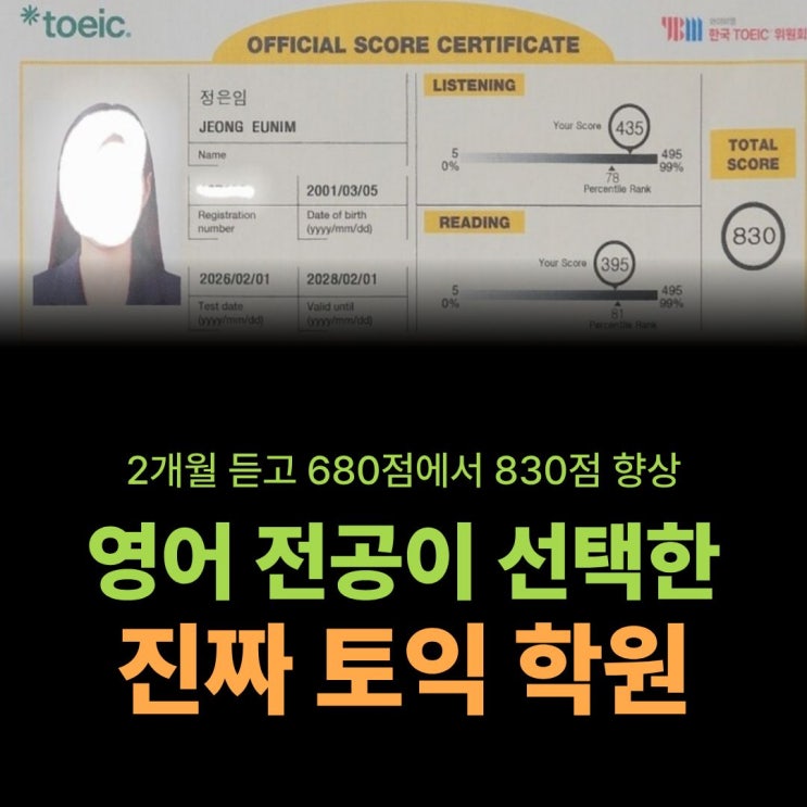 취업을 위해서 시작한 토익이 재밌게 느껴지고 555점→680점→830점까지 차근차근 점수를 올린 은임이의 소식이에요! 은임이는 처음에 700+ 저녁반 수업을 2개월 동안 들으면서 기초를 확실하게 쌓고 680점으로 올렸고 이후에 800+반 2개월 수업을 통해 830점까지 올렸어요. 토익공부만 생각하면 막막하고, 어렵게 느껴지고, 해결해야 하는 숙제처럼만 느껴졌다면 은임이의 이야기가 도움 되실 거예요. 영어영문학과지만 토익은 싫어 은임이는 영문학과 학생이지만 처음엔 토익에 대해 부정적인 생각이 있었어요. 영어와 토익을 별개로 생각했거든요. 그래서 토익을 공부하는 것이 정말 영어 실력에 도움이 되는지 항상 의문이 있었고 취업을 위....... <img src="https://blogthumb.pstatic.net/MjAyNjAyMjVfMTA5/MDAxNzcyMDI3OTMyNDc1.Vm2Aqlxp-cWHjwF93x3U7_YZvOnOeeCxjtjV_mZzqAsg.d5X-FCwXIHxgp-DclGQHqHdQsAyVE4anN3vtDw971Twg.JPEG/%C0%FA%B3%E1%B9%DD%C0%BB_%B0%C5%C3%C4_800%2B%B9%DD_2%B0%B3%BF%F9_%C8%C4_830%C1%A1_%B4%DE%BC%BA_%BC%F6%BF%F8_%C0%FC%BC%AD%C7%F6%C5%E4%C0%CD%C7%D0%BF%F8_%C0%BA%C0%D3%C0%CC%C0%C7_%C0%CC%BE%DF%B1%E2.jpg?type=s3" />