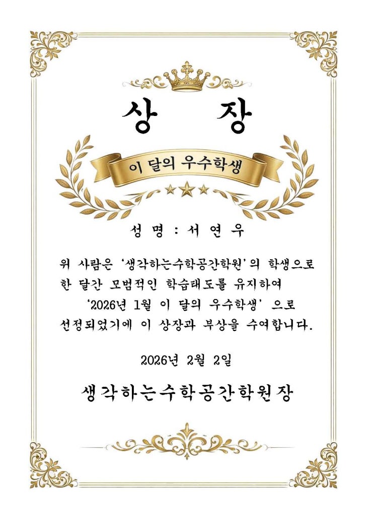 수학은 단기간에 점수로 증명되는 과목이 아닙니다. 매 시간의 태도, 반복되는 복습, 스스로 이해하려는 습관이 쌓여 결국 실력이 됩니다. 이번 달, 그 과정을 끝까지 지켜낸 학생들을 소개합니다. 성실함은 눈에 잘 띄지 않지만, 결과는 반드시 따라옵니다. 앞으로도 점수보다 과정, 속도보다 이해, 양보다 밀도를 중요하게 지도하겠습니다. 성실하게 임해준 학생들에게 진심으로 박수를 보냅니다 [수학공간 상담예약하기] ☎ 031-994-1600 <img src="https://blogthumb.pstatic.net/MjAyNjAyMTFfNiAg/MDAxNzcwODE3ODk1ODM3.Kv9Mn3jAYykqkY40L9U6kUP9_-Iix-SvUnPR74ct3kkg.jploEnXWNBXJ2y70tLl-_oBZH2sjLVt0TEysYvdMrwUg.JPEG/KakaoTalk_20260211_223629589.jpg?type=s3" />