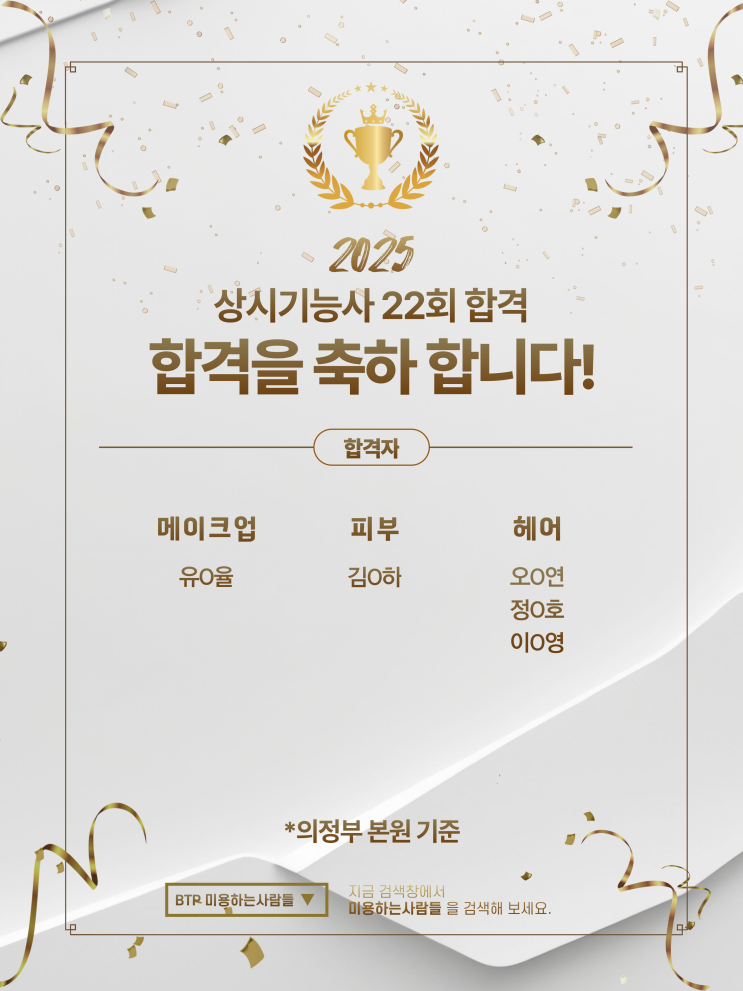 상시기능사 합격 발표 안녕하세요! 의정부 미용학원 BTP 미용하는사람들 뷰티아카데미 입니다. 지난 11일(목) 25년 22회차 미용 상시기능사 합격자 발표가 이루어졌는데요. 얼마 남지 않은 25년 합격자발표! 과연 22회차에는 어떤 과목에서 합격생을 배출했는지 지금 바로 확인해보세요. 이번 시험에서는 메이크업, 피부, 헤어 과목에서 합격생을 발표했는데요! 연말이지만 끝까지 집중해서 목표로한 자격증 취득에 성공한 합격생 여러분 모두 다시 한번 축하 드립니다! 이제 25년도 정말 얼마 남지 않았는데요. 합격자 발표 역시 23회차 발표를 남겨 두고 있는 상태 입니다. 25년 야심차게 미용 분야 진출을 위해 도전 하신 분들 모두 목표 달성....... <img src="https://blogthumb.pstatic.net/MjAyNTEyMTJfMTM1/MDAxNzY1NTM1MjE0OTM5.Wul7NXeZ9re2jzADOm6iq7LEbkWtI9XPDHRHAukhZ1Ag.MgCV4_xFEBF_E1EIxyLwtcnEEW24Matu0ZBTPB7u_q8g.PNG/001.png?type=s3" />