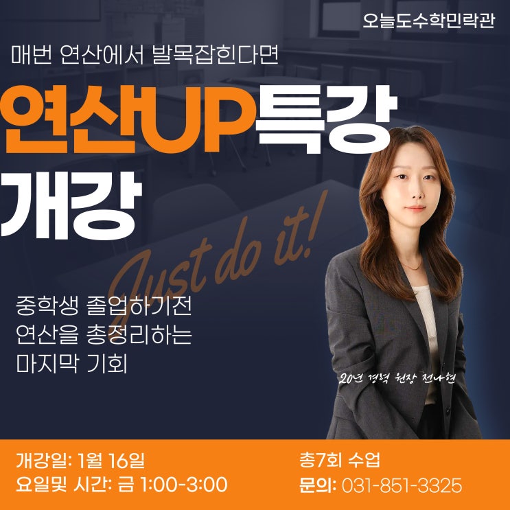 의미 없는 특강은 하지 않습니다. 안녕하세요. 오늘도수학학원 원장 전나현입니다. 이번 겨울방학은 예비 고1에게는 고등 수학의 기초를, 예비 고2에게는 심화 과목의 선행을 다지는 가장 중요한 시기입니다. 저희는 고등 입시 성공을 위한 명확한 목적을 가진 특강만을 진행합니다. 1. 예비 중3 (현 중2) 겨울방학 특강 가이드 이제부터 중3은 예비 고1이라는 생각으로 학습을 계획해야 합니다. 이번 겨울은 복습할 시간, 혹은 더 진도를 나갈 소중한 시간입니다. 중등 1학기 연산 특강 추천 대상: 1학년 1학기 또는 2학년 2학기 연산과 개념에 구멍이 있는 학생 목표: 연산 실수 없애기 & 시간 내 문제 풀기 이 두 가지 목적 달....... <img src="https://blogthumb.pstatic.net/MjAyNTEyMTlfMTIy/MDAxNzY2MTQwMjg4NjUx.qWfYOcf4GSl5pDIEVvuEWl_S43LyfFVXb_Hj-wWVDEcg.Nrpn-3jUjtqajIqxl3geA36UnQI_tY39rBLXEff_u30g.JPEG/%BC%B3%B8%ED%C8%B8%C4%AB%B5%E5%B4%BA%BD%BA-005.jpg?type=s3" />