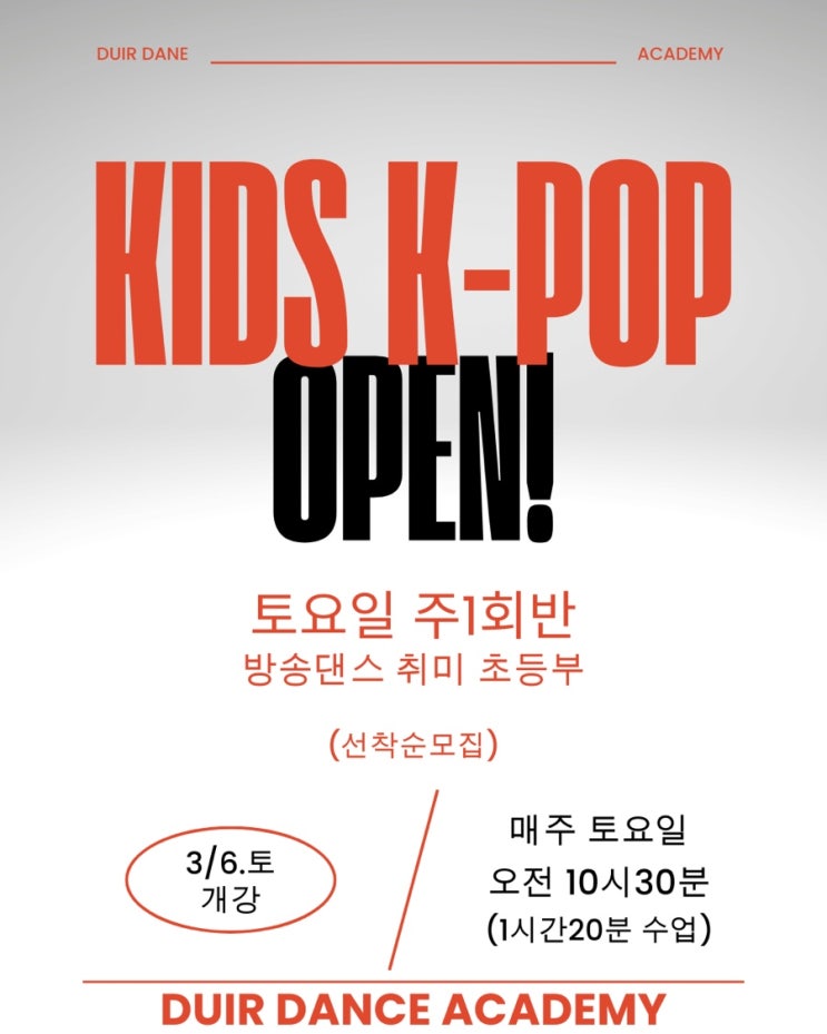 아이의 끼와 자신감을 깨워줄 시간 — 평일에는 시간이 없어서 수업을 듣지 못했던 아이들과 부모님들을 위해, 방송댄스 취미 초등부 토요반이 새롭게 오픈합니다! 수업 안내 • 3월 6일 토요일 개강 • 매주 토요일 • ⏰ 오전 10시 30분 • ⏳ 1시간 20분 수업 • 대상 : 초등부 • 수업 내용 : K-POP 방송댄스 • ✔ 선착순 모집 이런 친구들에게 추천해요! ✔ K-POP을 좋아하는 아이 ✔️ 평일에는 시간내기 어려웠던 아이 ✔ 무대에서 춤추는 게 꿈인 아이 ✔ 자신감과 표현력을 키우고 싶은 아이 ✔ 건강한 취미 활동을 찾는 아이 듀이르 키즈반의 장점 ✨ 아이들 눈높이에 맞춘 체계적인 수업....... <img src="https://blogthumb.pstatic.net/MjAyNjAzMDFfMjI5/MDAxNzcyMzQwNDYyOTMx.5j5GRbEMX8Gmmbm29JG3QKCw8Tf2HFxczx-6vKNZ0skg.KZ5ajUJ4hvAuHDvf-2GaNcp5T_7-X5xrbxiKIwYR2Dwg.JPEG/IMG%A3%DF6844.jpg?type=s3" />