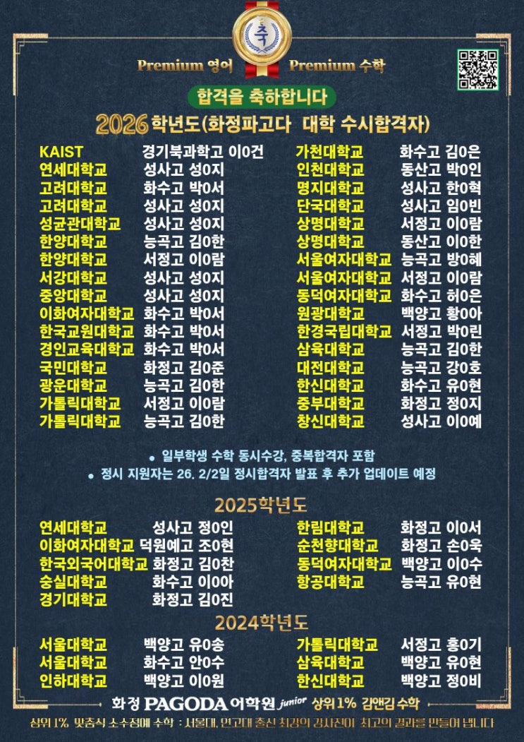 화정영어학원-2026학년도 수시합격자-화정파고다, 중등부영어, 고등부수능영어, 상위권대상 고등부수학 입시전문학원