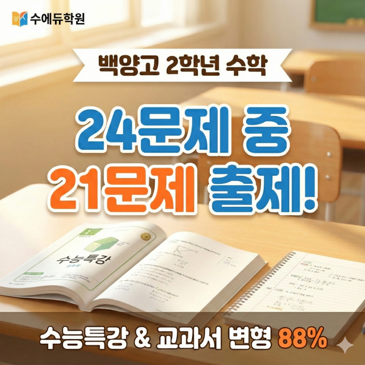 안녕하세요. 백양고 출제 경향을 누구보다 꿰뚫고 있는 수에듀학원입니다. 지난 2학년 2학기 기말고사, 성적표를 받아들고 아쉬워하는 학생들이 참 많았습니다. 시험이 어려워서였을까요? 아니면 아이들이 수학적 재능이 부족해서일까요? 제가 이번 백양고 시험지를 한 문항 한 문항 뜯어보며 내린 결론은 "방향이 틀렸다"입니다. 팩트 체크: 백양고 2학년 2학기 기말고사 분석석 이번 시험은 총 24문항이 출제되었습니다. 저희 학원에서 분석한 출처별 비중은 다음과 같습니다. 수능특강 및 교과서 변형: 21문항 1번부터 21번까지 (약 88%) 독창적 신유형/고난도: 3문항 (약 12%) 보이시나요? 전체 문제의 90% 가까이가 학생들이 학교....... <img src="https://blogthumb.pstatic.net/MjAyNjAxMDhfMTgw/MDAxNzY3ODQxNDUwMzcw.LdWGGL4-deFms1RhehcfyOCDy203Mjr8biLKm-xuikog.VeoAlI0eg0-OZ-USDEinJxn0_uiQ5_y5fr4L4aaI1xwg.PNG/Gemini_Generated_Image_qnpnt6qnpnt6qnpn.png?type=s3" />