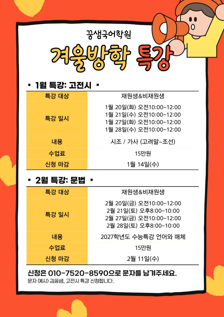 겨울방학은 국어 실력을 끌어올릴 수 있는 가장 중요한 시기입니다. “이번 방학만큼은 확실히 다져 놓자”는 마음으로 겨울방학 특강을 준비했습니다. 이번 방학, ✔ 도망치든가, 극복하든가! 다음 학기 성적으로 달라진 나를 보여줍시다! 1월 특강 | 고전시 고전시는 막연히 어렵다고 느끼는 학생이 많지만, 핵심 개념과 흐름만 잡히면 오히려 점수로 연결되기 쉬운 영역입니다. 시조·가사(고려말~조선)의 기본 구조 정리 자주 출제되는 표현과 주제 유형 집중 정리 “외워야 할 것”이 아니라 “이해할 수 있는 것”으로 만드는 수업 2월 특강 | 문법 문법은 한 번 제대로 정리해 두면, 내신·모의고사·수능까지 계속 써먹을 수 있는 든든한 무....... <img src="https://blogthumb.pstatic.net/MjAyNjAxMDdfMTk0/MDAxNzY3NzYxMDE1MDI3.LF5lvG_5upEM5UsPm8otwjliJ1-fL1ZaLEsea0p4lnog.2jC6oGYj3HcYxv2nQxjMLzvEZ6lPu6DnidXlNRs0H1Ig.JPEG/KakaoTalk_Photo_2026-01-07-13-33-41.jpeg?type=s3" />