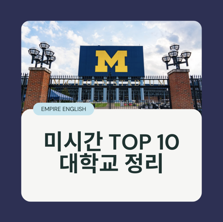 안녕하세요 일산 학부모님들 엠파이어 어학원 릴리 원장입니다! 2018년부터 지금까지 엠파이어 어학원은 식사동 No. 1 원어민 영어교육 환경을 제공합니다. 미국 유학을 준비할 때 가장 고민되는 것이 어느 대학을 선택해야 하는지인데요. 특히 미시간(Michigan) 주는 교육 수준이 높고, 공립·사립 모두 명문학교가 많아 한국 학생들에게도 꾸준히 인기 있는 지역입니다. 오늘은 미시간의 대표 대학을 TOP 10 순위로 정리, 각 학교의 SAT 평균 점수 합격률 공립/사립 여부 강한 전공 학교가 중요하게 보는 요소 까지 한 번에 보기 쉽게 정리해드릴게요! 1. University of Michigan – Ann Arbor (UMich) 공립 명문(Public) / 미국 Top 25 평....... <img src="https://blogthumb.pstatic.net/MjAyNTEyMDVfMTY0/MDAxNzY0ODk0MTc2ODIy.PNYj1U5buacydfDwAQm2IeegqHHyTb_n87wm9yZCplwg.3HWXvKWLGIeG5APOZQ3fpfaUQ9DOtgSciTRq1glzO_Eg.PNG/Screenshot_2025-12-05_at_9.22.48%3FAM.png?type=s3" />